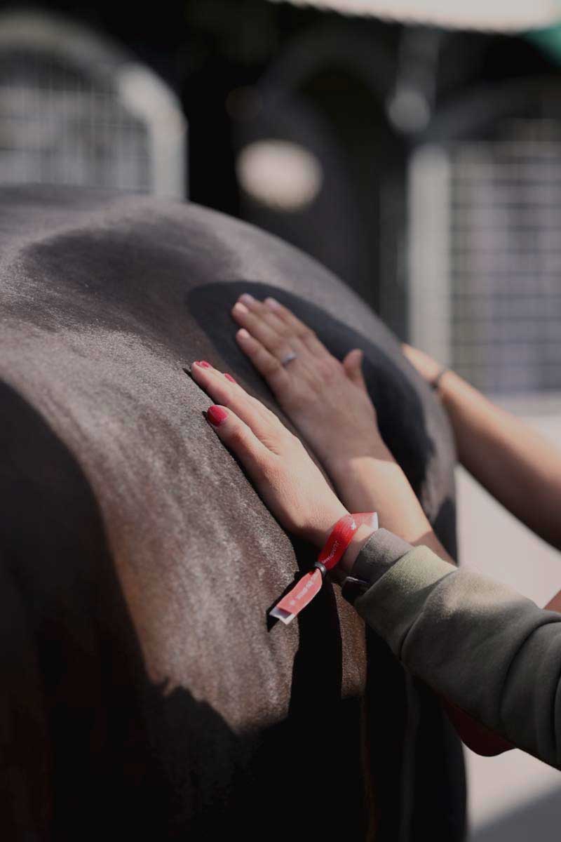 Utiliser votre toucher comme outil de communication avec le cheval et ses tissus et de l’ajuster en fonction de son ressenti et des réactions de l’animal.